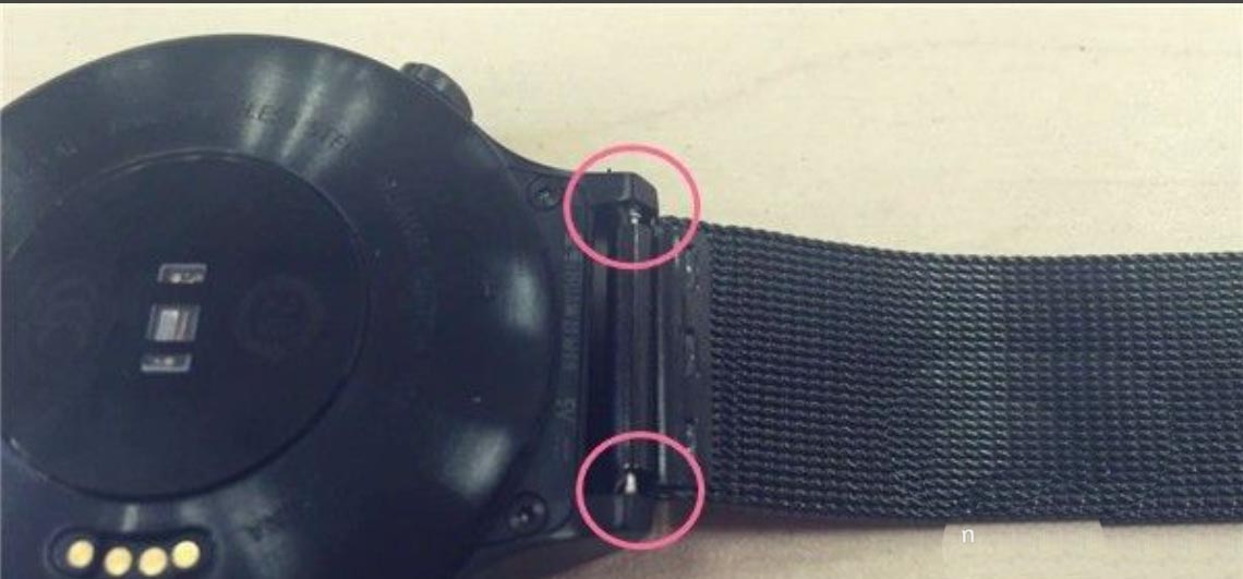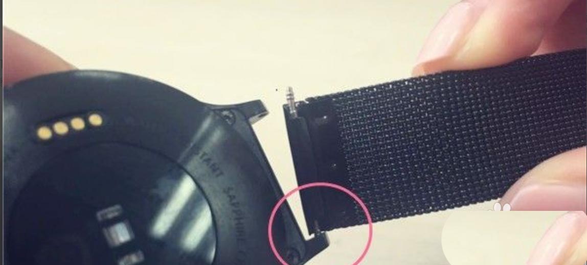在原表带的下方有个小按钮,这个按钮就是所谓的开关啦,只要按照图上标注的箭头方向,打开原装表带扳动开关,然后轻轻一拽,原表带就可以拆掉啦!